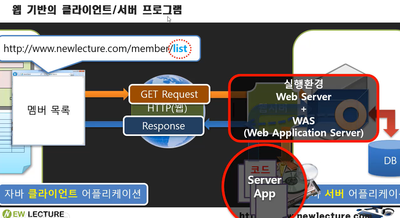 1. 웹서버 (실행환경) 2. 그것에 대한 코드를 실행해주줄수있는 환경 WAS (Web Application Server)