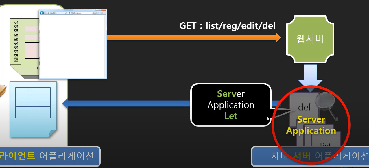 사용자가 요청하는 내용들이 list/reg/edit/del 요청을 하면 웹서버는 서버에 의해서 찾아질수있는 코드가 서버 어플리케이션에서 읽혀진다. 사용자 요청이 어떤거에 따라 그떄그때 마다 실행되고 전달되고 이프로그램은 끝나는데
