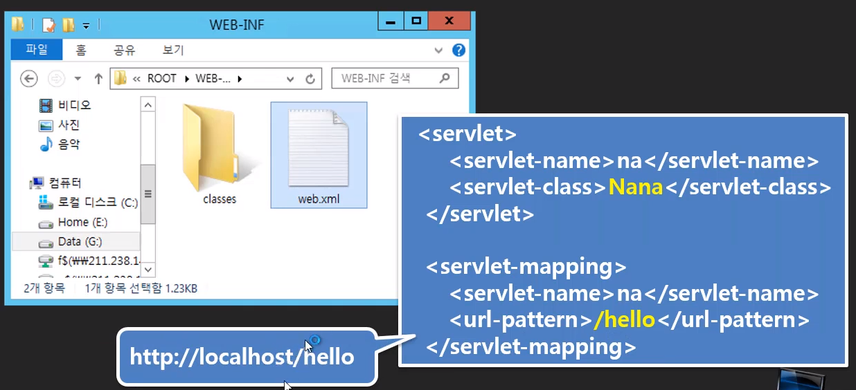 만약 Nana클래스가 있으면 urp-pattern 에 hello가 오면 서블릿네임 na를 실행하는데