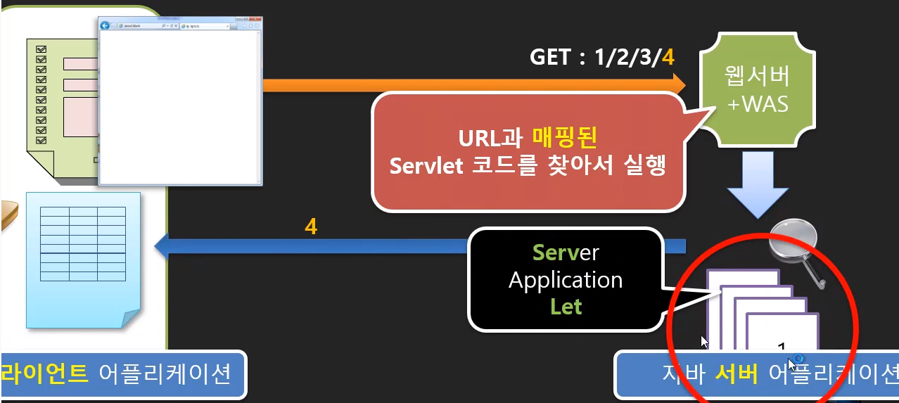 Hello 라는 이름으로 요청하고 톰켓이 왔을 때 해당하는 서블릿 클래스를 찾아서 실행해준다.