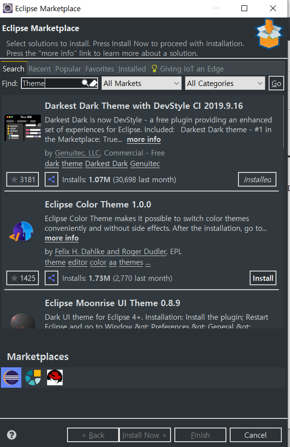이클립스를 처음 접하면 그대로 사용하기 보다는 마켓플레이스에서 필요한것들을 다운받아 사용하는 것이 좋다. 그 중 가장 추천하는것이 스킨인데 어두운 스킨을 써야 눈에 좋기 때문이다.