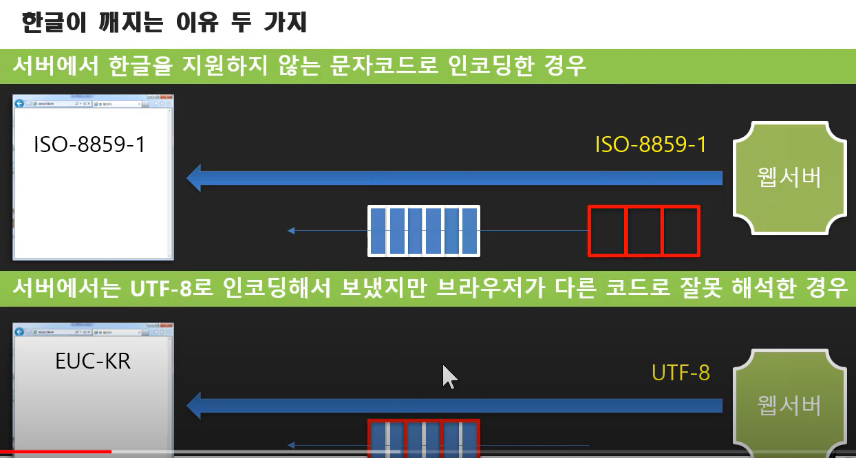 1바이트로 한글 하나를 얻고 2바이트씩 묶어서 표현해야하는데 ISO-8859 에서 쓰는 톰켓에서는 한바이트씩 보기떄문에 ? 표로 나온다.