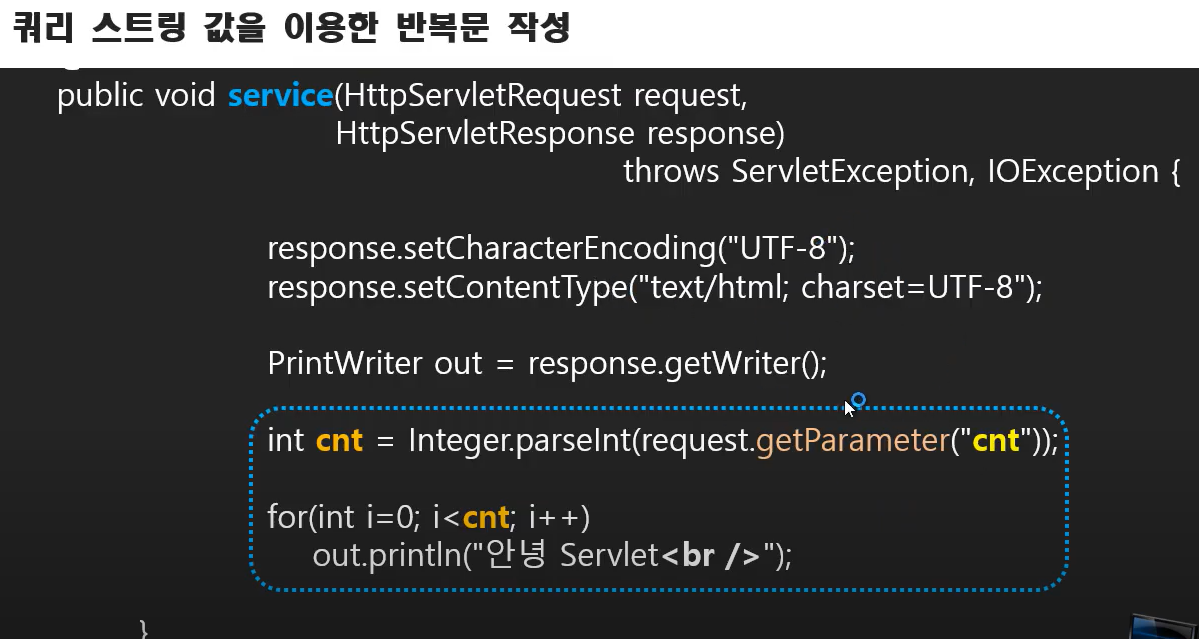 int cnt = Integer.parseInt(request.getParameter("cnt")); // 요청 문자열을 정수로 쓰고 싶다면 ?