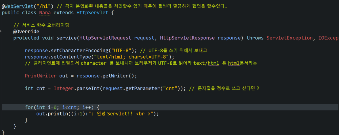 @WebServlet("/hi") // 각자 분업화된 내용들을 처리할수 있기 때문에 훨씬더 깔끔하게 협업을 할수있다.