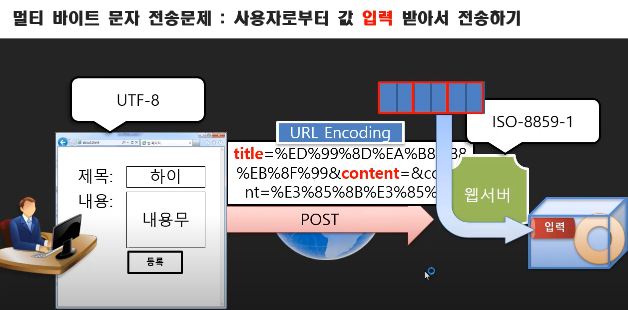 POST하면 2바이트씩 해서 한문자로 인식한다 톰켓에서의 인코딩 방식은