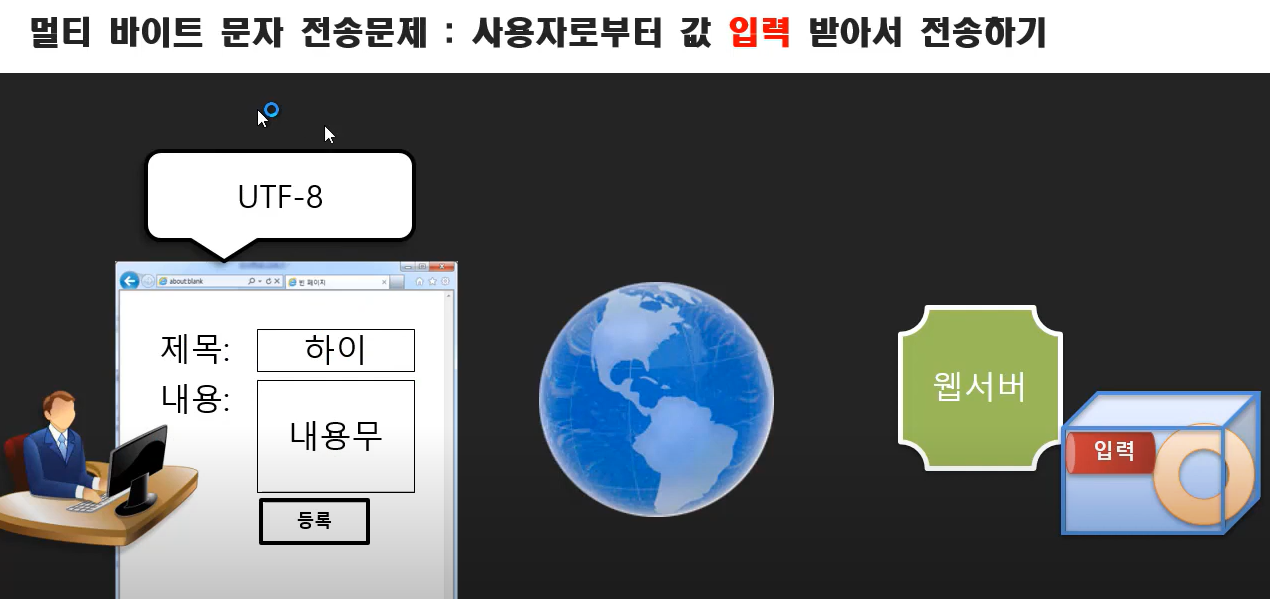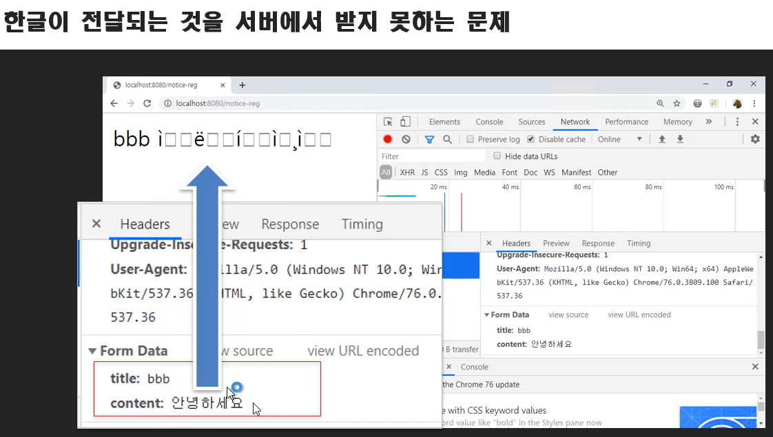 한글을 출력하는데 문제가 없었는데 아마 전달하다가 POST 하다가 문제가 발생한듯 하다