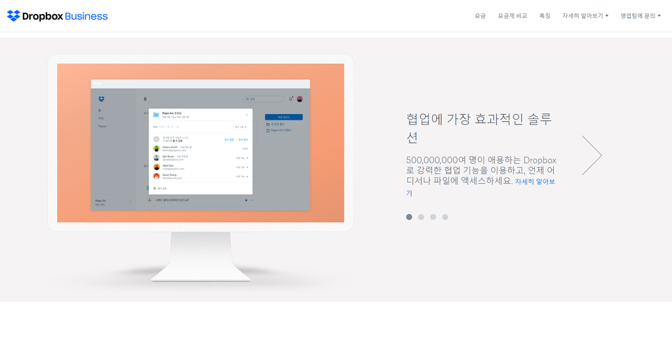 드롭박스는 클라우드 스토리지(저장소) 서비스입니다 이러한 서비스를 만든 대표가 USB 들고 다니기 귀찮아서 만들었다고 하죠. 드롭박스를 사용하면 현재 위치 또는 작업 중인 장치에 상관없이 작업을 동기화할 수 있습니다. 개인은 Dropbox를 무료로 사용할 수 있지만 가장 저렴한 비즈니스 버전은 더 많은 공간(1TB) 과 우선순위 전자 메일 지원 및 더 높은 공유 제한과 같은 더 많은 기능을 제공합니다.
