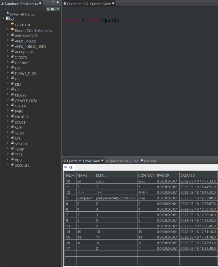 select num,name,email,content,ipAddr,created
