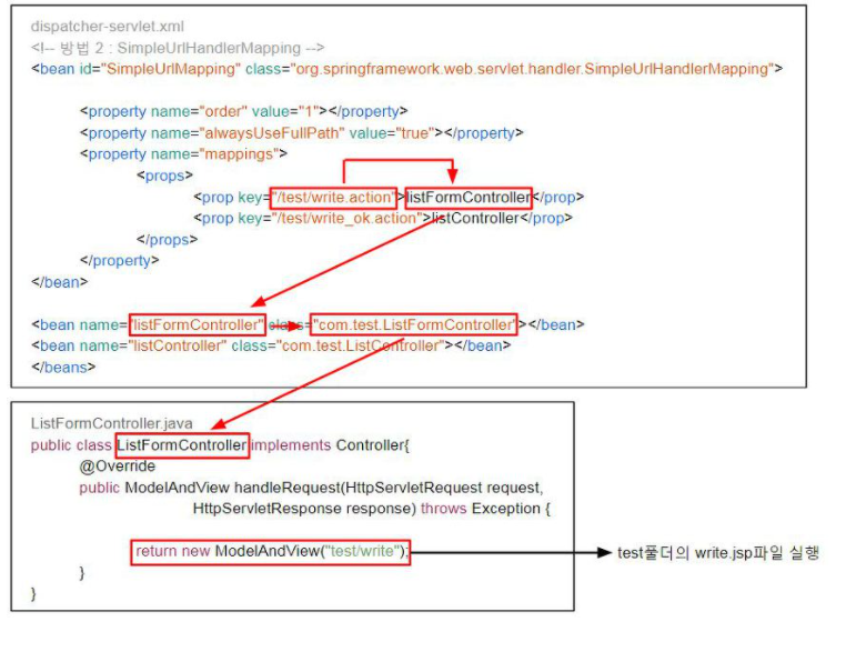 | SimpleUrlHandlerMapping | 패턴과 컨트롤러의 이름을 비교 URI가 패턴에 매칭 될때 지정한 컨트롤러를 사용한다. |