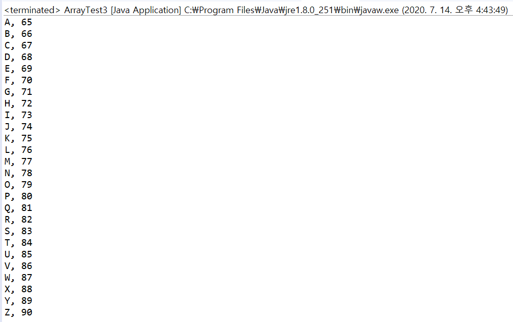 System.out.println(alphabet[i] + ", " + (int)alphabet[i]);