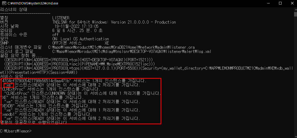 -lsnrctl status 명령어를 입력해서 오라클 리스너 상태를 확인합니다.