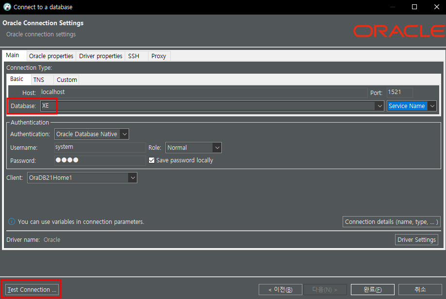 3. Default로 Database Name이 ORCL로 잡혀있는데 사용하는 Database 는 XE니 변경해줍니다.