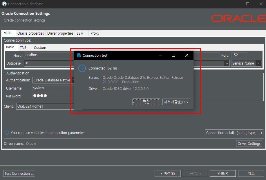 오라클 연결이 정상적으로 된것을 확인할 수 있습니다.