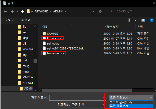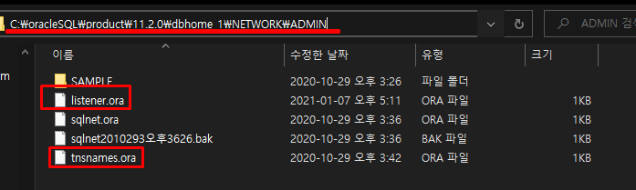 첫 번째로 listener.ora 라는 파일과 두 번째로 tnsnames.ora 라는 파일을 수정해야한다.