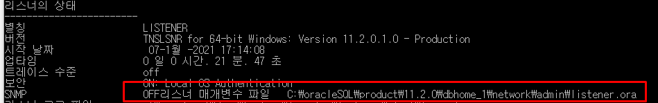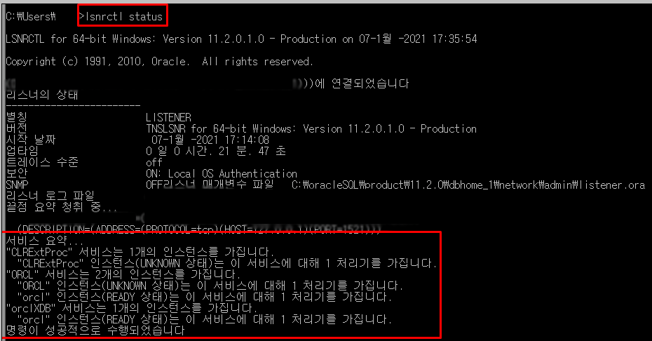 명령어에 lsnrctl status 를 입력한다.