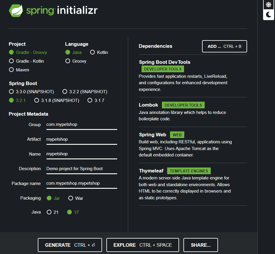 Dependencies 의 경우 , 일단 필수적인 패키지만 구성 했고 , 나머지 Security , OAuth 같은 패키지는 필요에 따라 나중에 추가 할 계획이다.