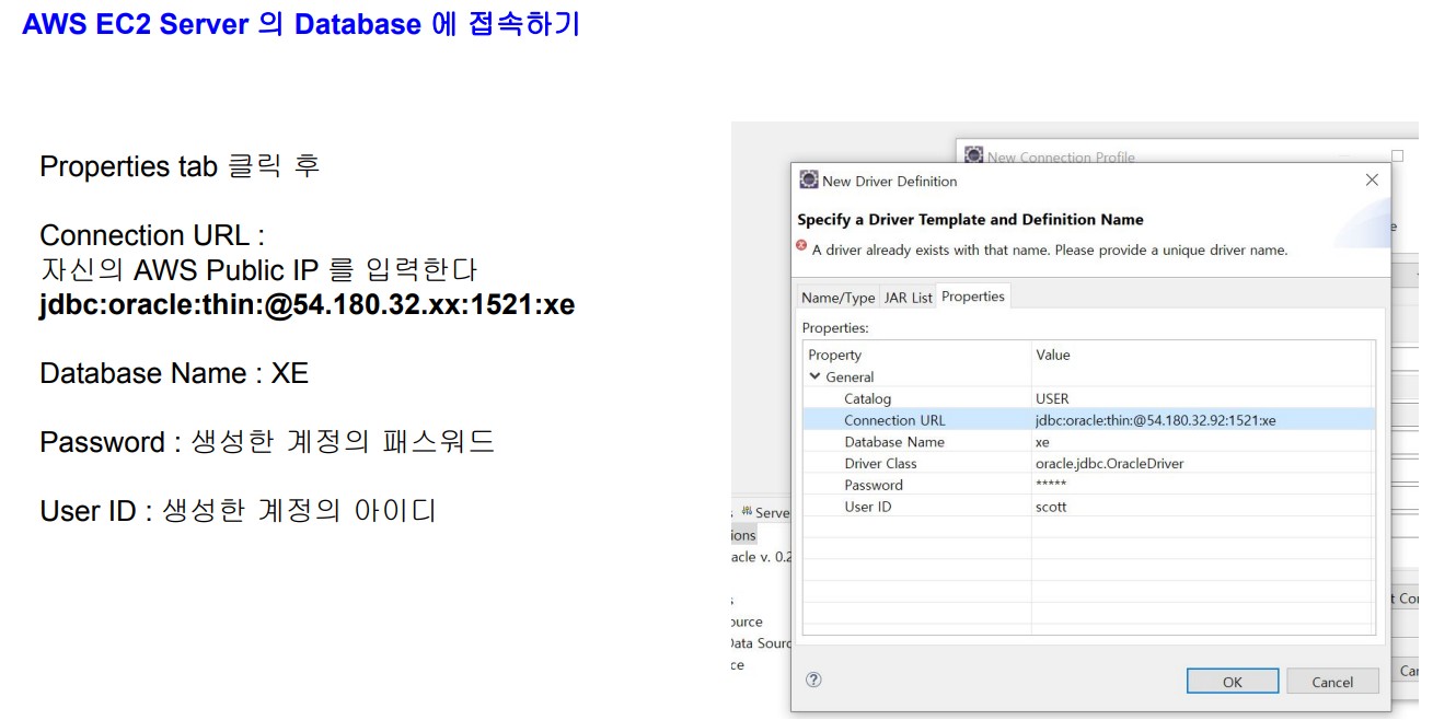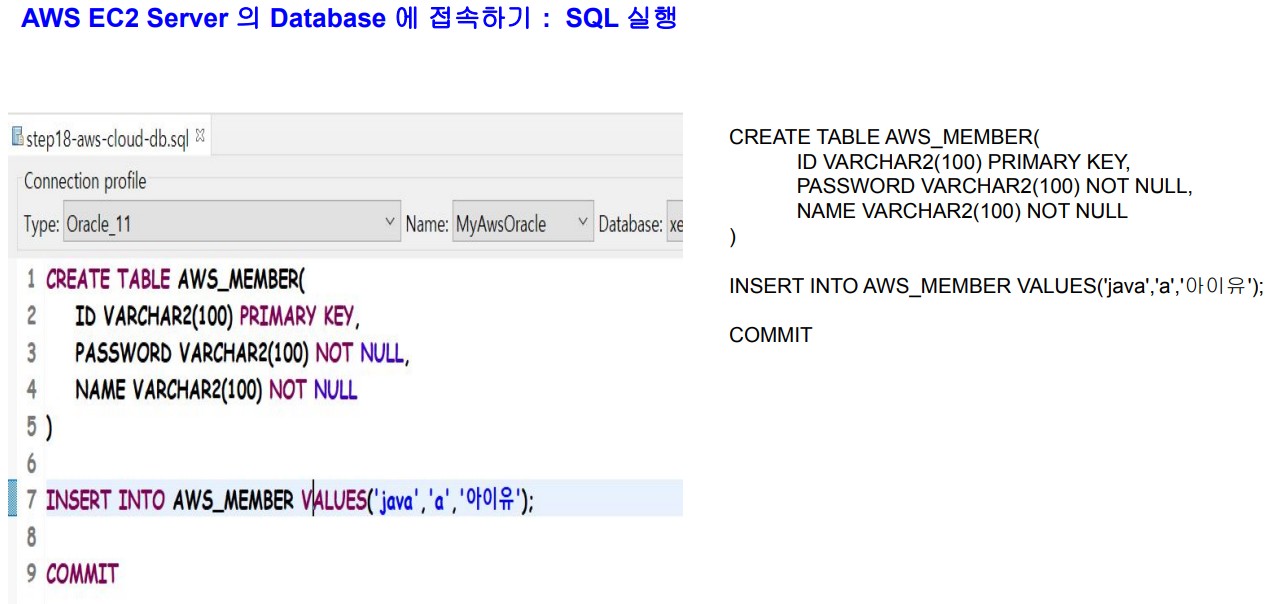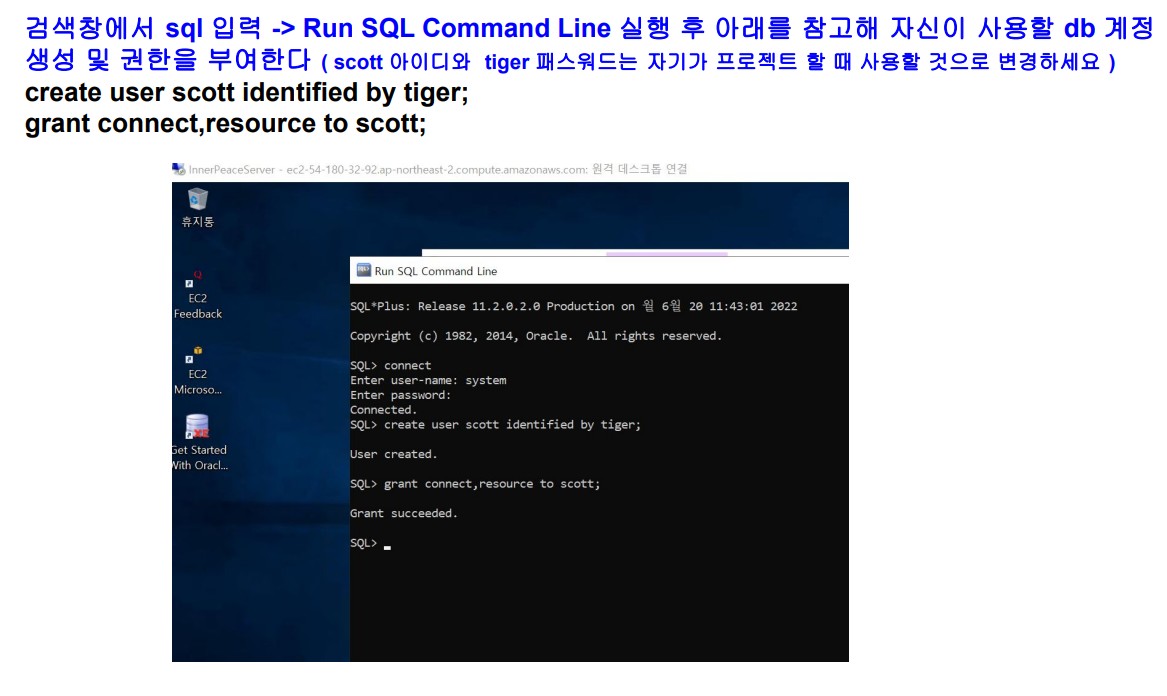 exp userid=system/oracle file=C:\scott.dmp owner=scott 파일로 export 한 후 RDP 를 이용해 AWS EC2 Server에 파일을 배치( C:\scott.dmp ) 하고 명령프롬프트(cmd) 창을 관리자 권한으로 실행 한 후 import 명령문을 실행하면 됨 oracle import 명령문 imp userid=system/oracle file=C:\scott.dmp fromuser=scott touser=scott