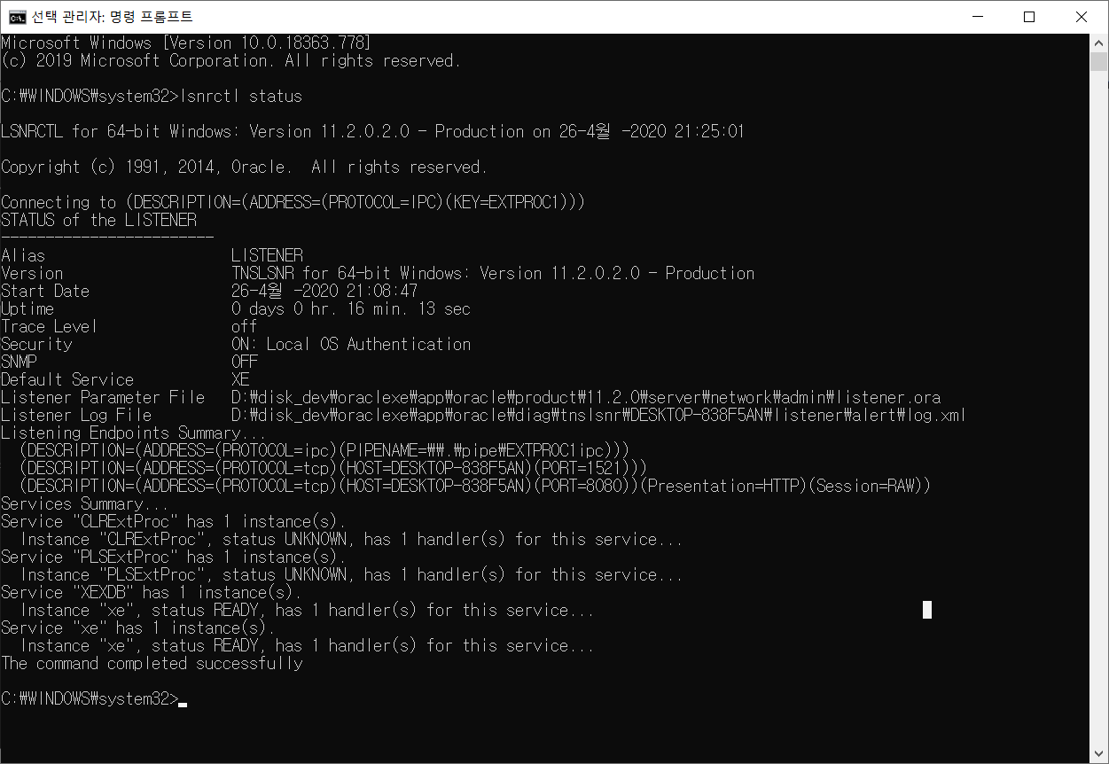 관리자모드로 실행 > lsnrctl status : 리스터 상태 확인