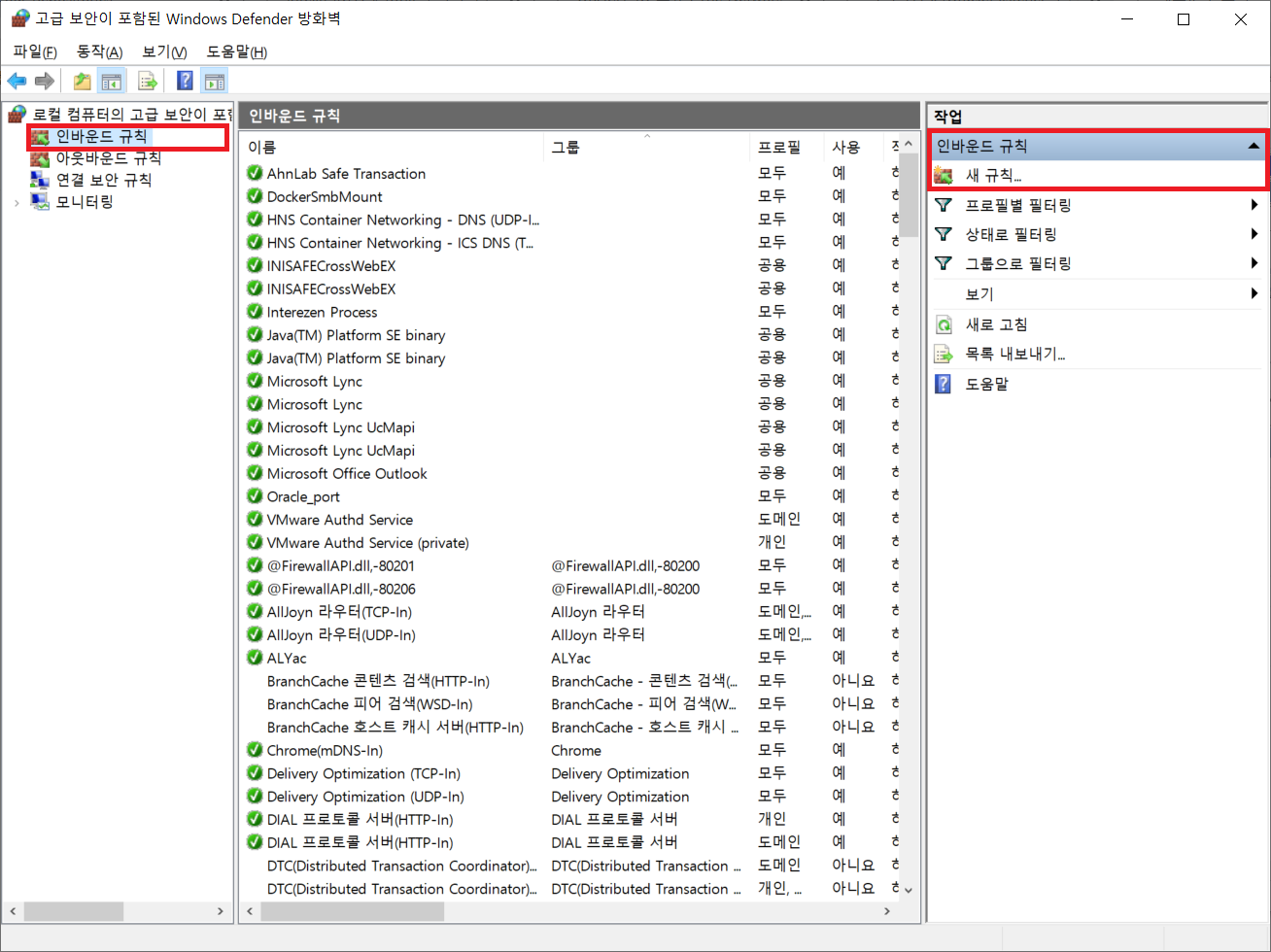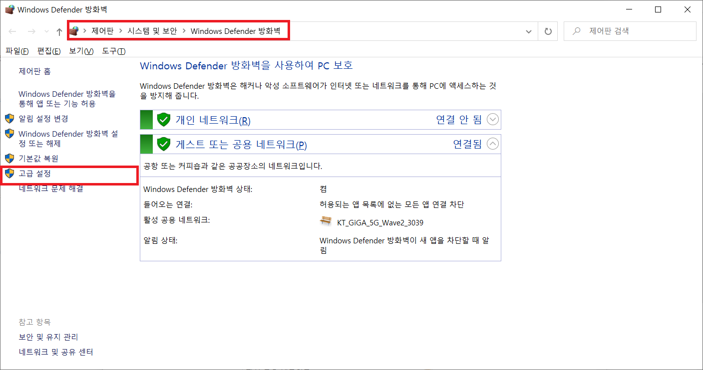 제어판 - 시스템 및 보안 - Windows Defender 방화벽 - 고급 설정