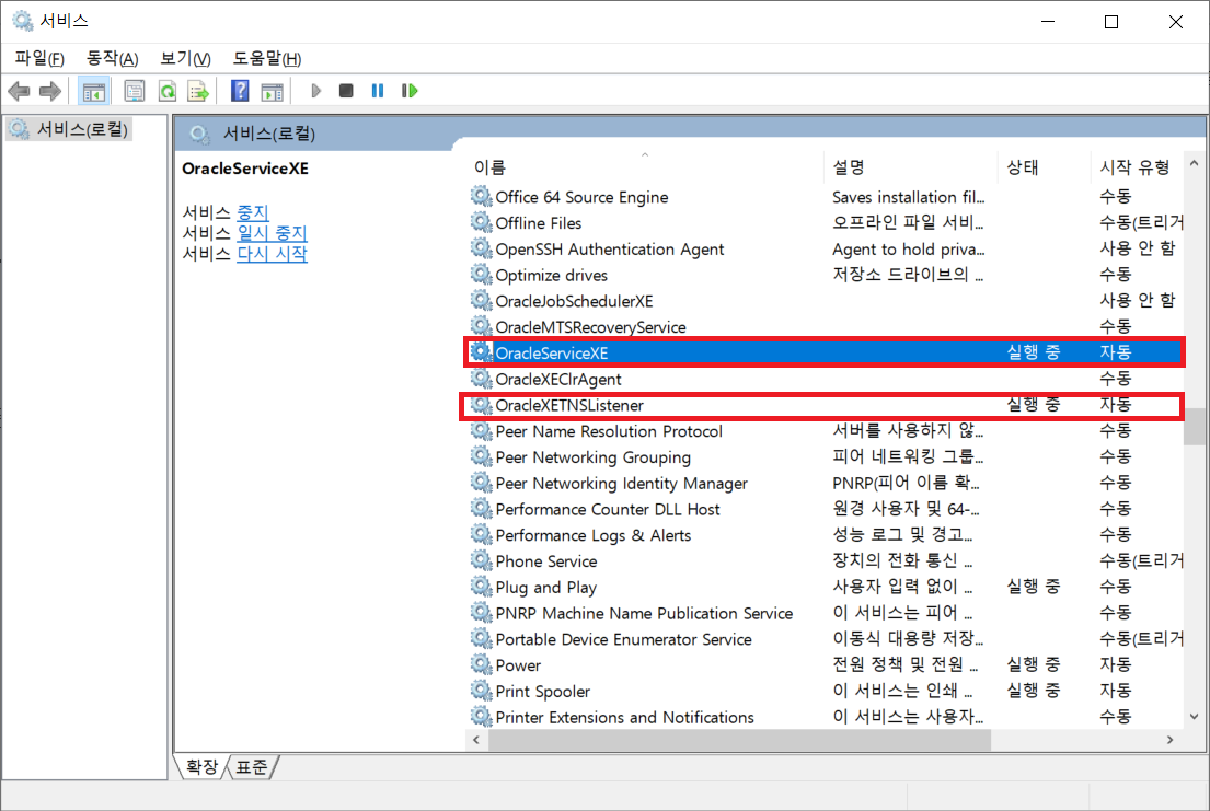 3. 서비스 - OracleXE, OracleXETNSListener 확인
