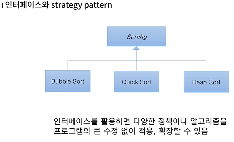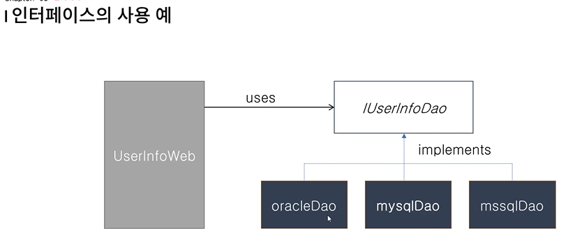 // 간단한 내용을 보여드린거고 실제적으로 인터페이스를 정의해 놓고 프로젝트 할때 정의된 인터페이스를 가져다가 구현하는게 많다